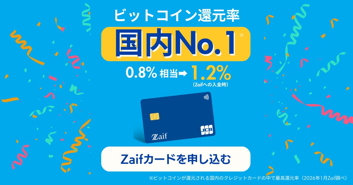 ビットコインが還元されるクレジットカード「Zaifカード」の還元率が、2026年2月1日(日)よりZaifでの利用に限って1.2%相当に引き上げられました。