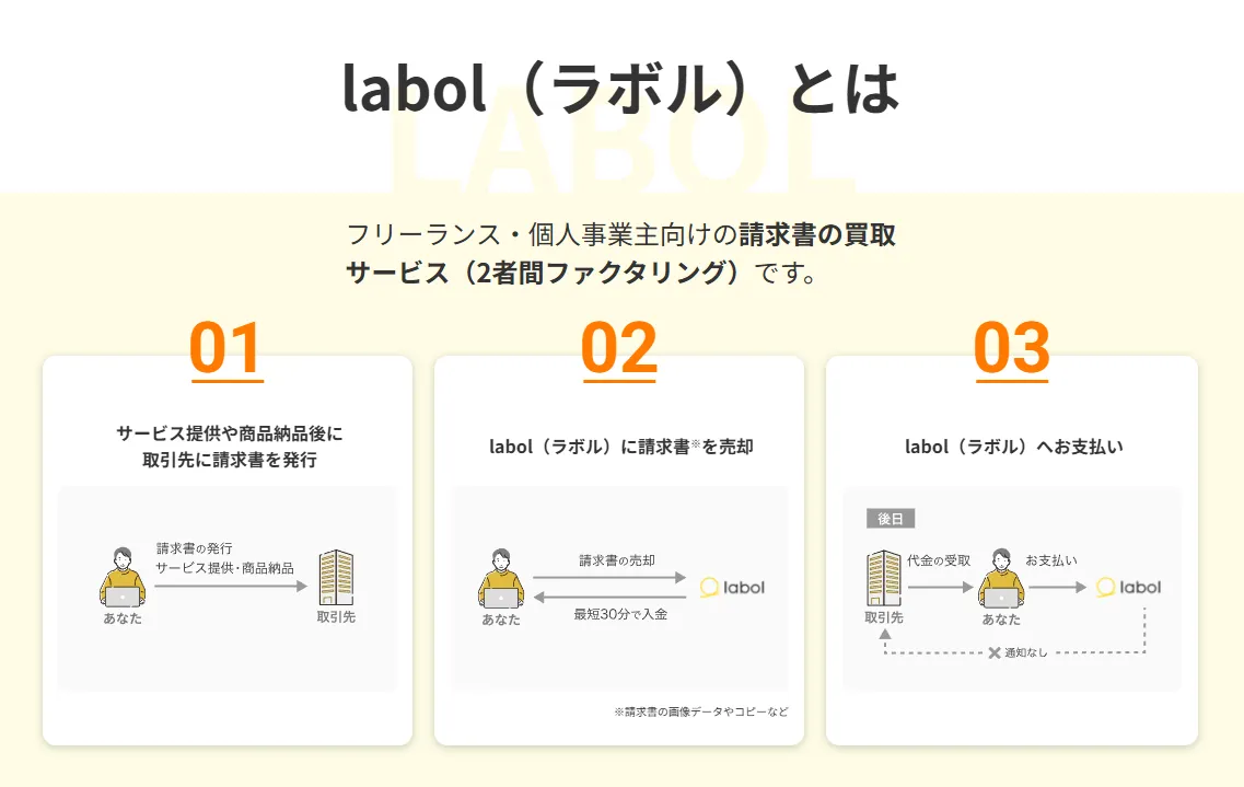 labol(ラボル)は、フリーランスや個人事業主向けに提供されている請求書買取型のファクタリングサービスです。請求書を売却して、報酬の入金日よりも早く現金を受け取れる仕組みで、資金繰りを安定させたい方に利用されています。
