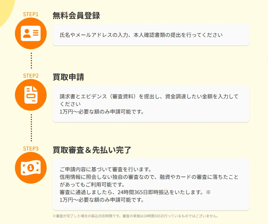 必要な書類は「請求書」「本人確認書類」「取引先とのやり取りのわかる資料(契約書やメールなど)」のみで、手続きが比較的シンプルなのも魅力でしょう。