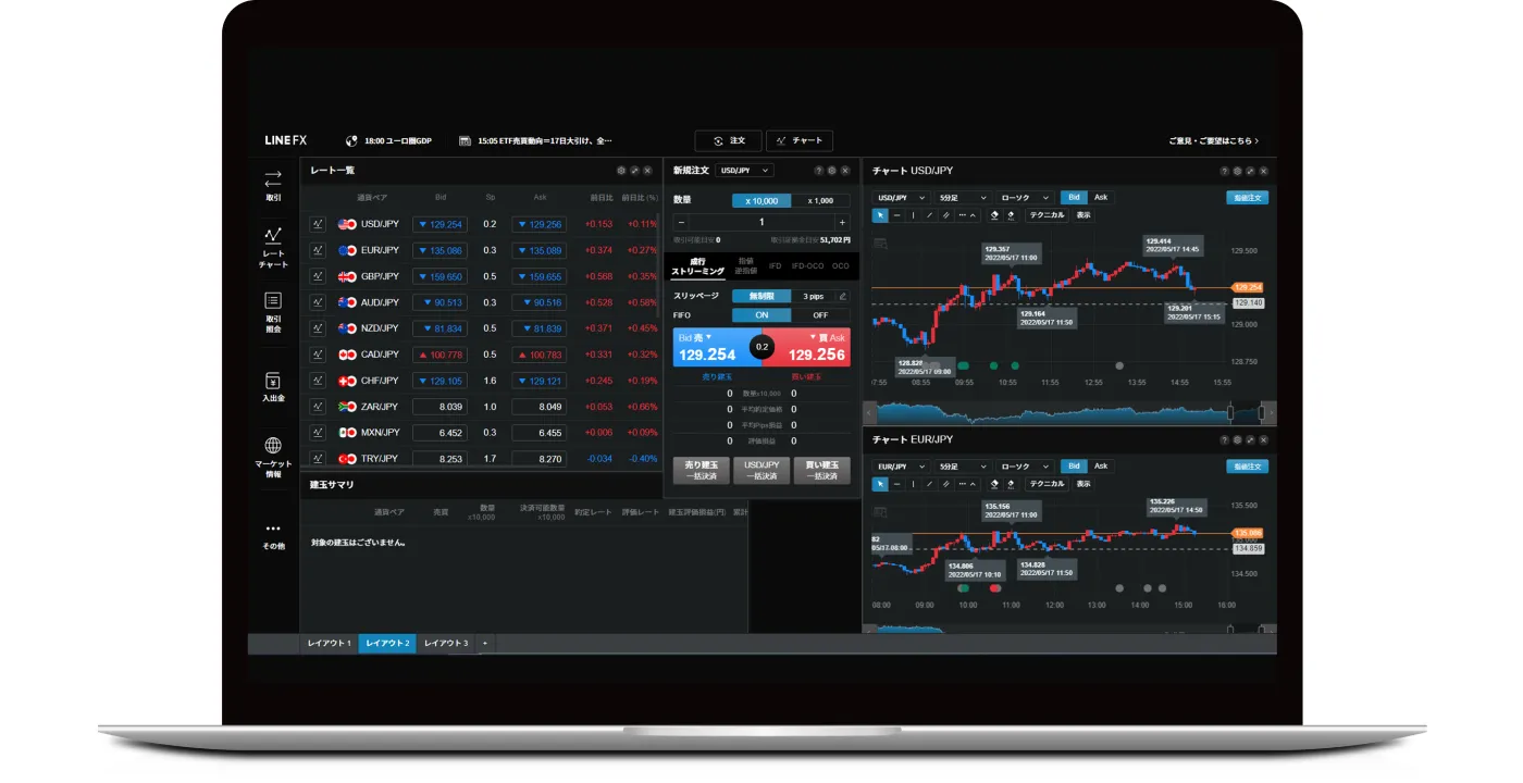 「LINE FX Pro」は、PCの大画面でじっくり取引したい方に向けた高機能ツールです。多くの情報を1画面に集約し、スピーディーな操作と柔軟なレイアウトが魅力でしょう。