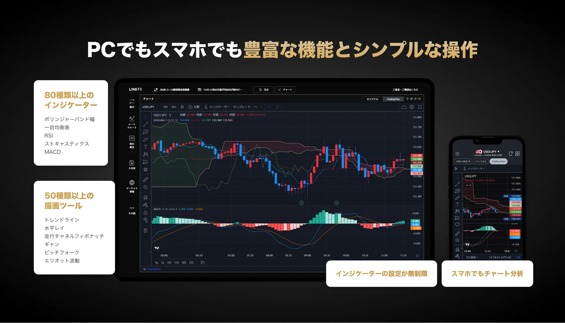 LINE FXでは、スマホ・PCどちらのツールでも人気のチャートサービス 「TradingView」 を利用できます。