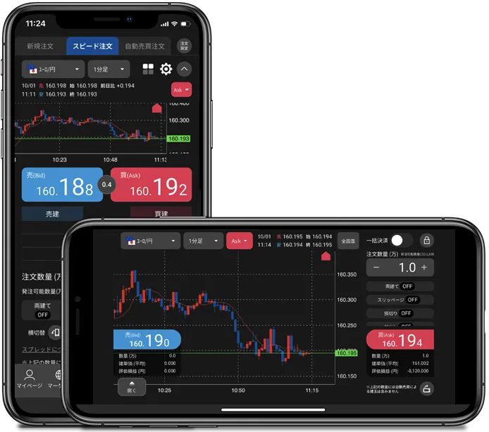 「スピード注文」機能では、売気配や買気配をタップするだけで即発注でき、チャートを見ながらタイミングを逃さず注文が可能です。