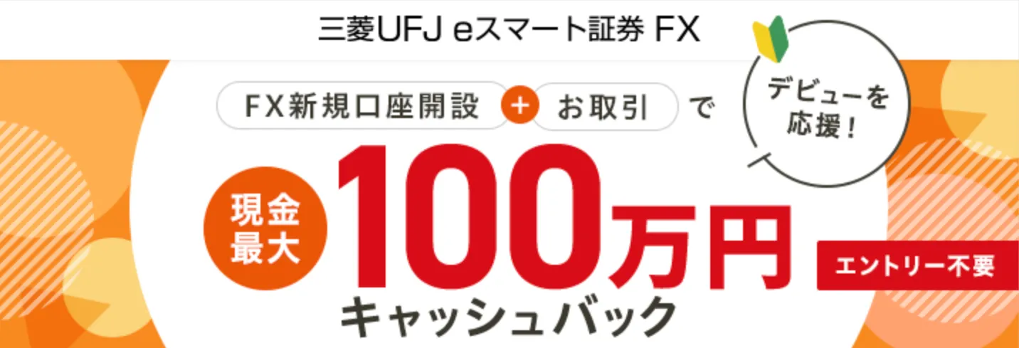 三菱UFJ eスマート証券(旧auカブコムFX)は、「新規口座開設+取引」で最大100万円キャッシュバックされるキャンペーンを開催しています。
