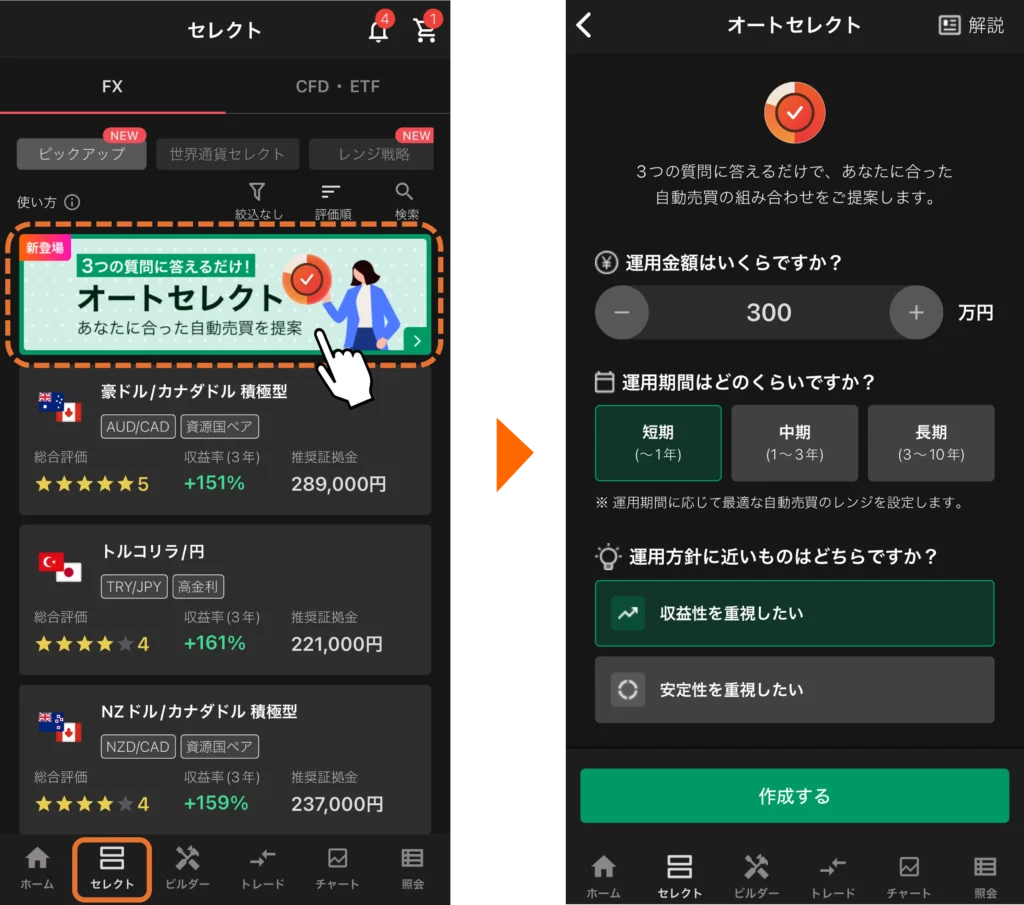 オートセレクトでは、「運用金額」「運用期間」「運用方針」の3つの質問への回答をもとに、自分に合った自動売買ポートフォリオが作成されます。