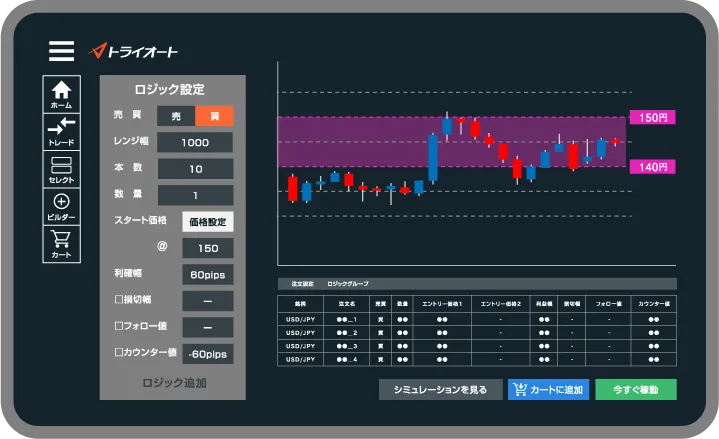 「チャートメイク」とは、トライオートFX独自の、視覚的かつ直感的な操作でトレードルールを作成できる機能です。