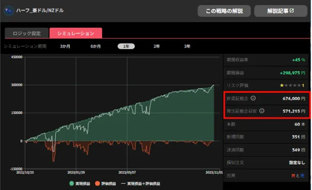 特に、作成したルールを過去のレートでテストできるシミュレーション機能が便利。ルールが過去の相場でどのような収益を上げていたかを確認でき、運用の目安となる推奨証拠金も確認できますよ!