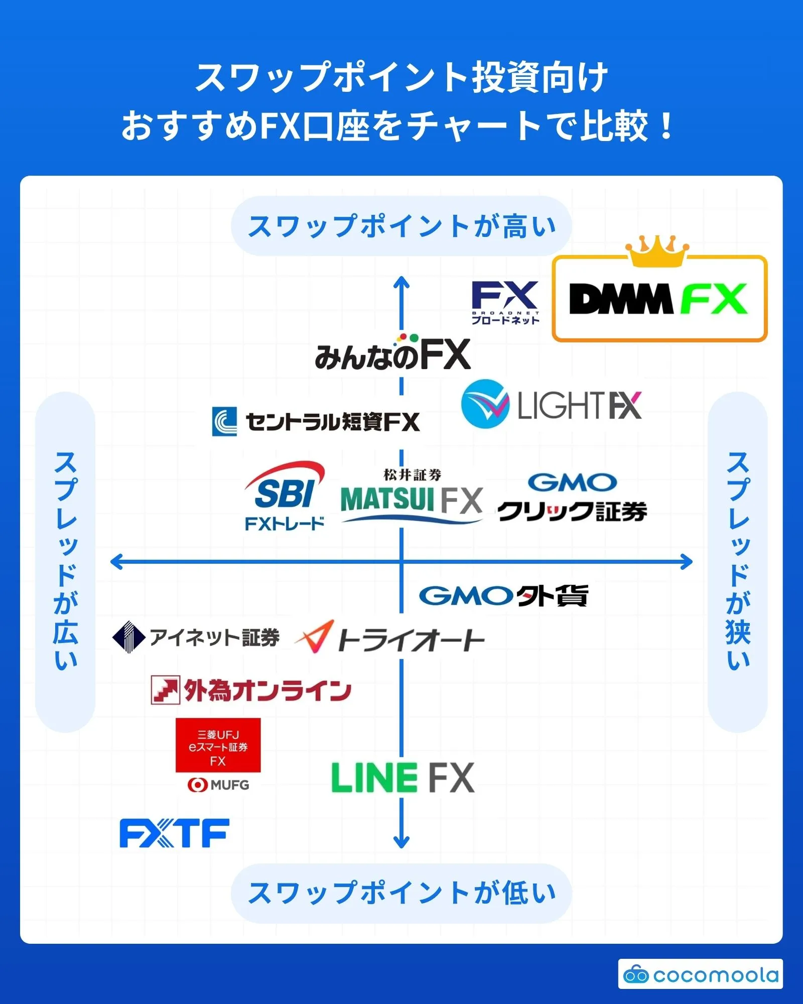 当サイト、ココモーラは金融庁に登録されているFX口座の会社のみを紹介しています。またココモーラのサービスは広告主のパートナー企業より報酬を得ています。ただし、広告主の好意的なレビューを書く保証をつける等で報酬を支払うなどは一切行っておりません。