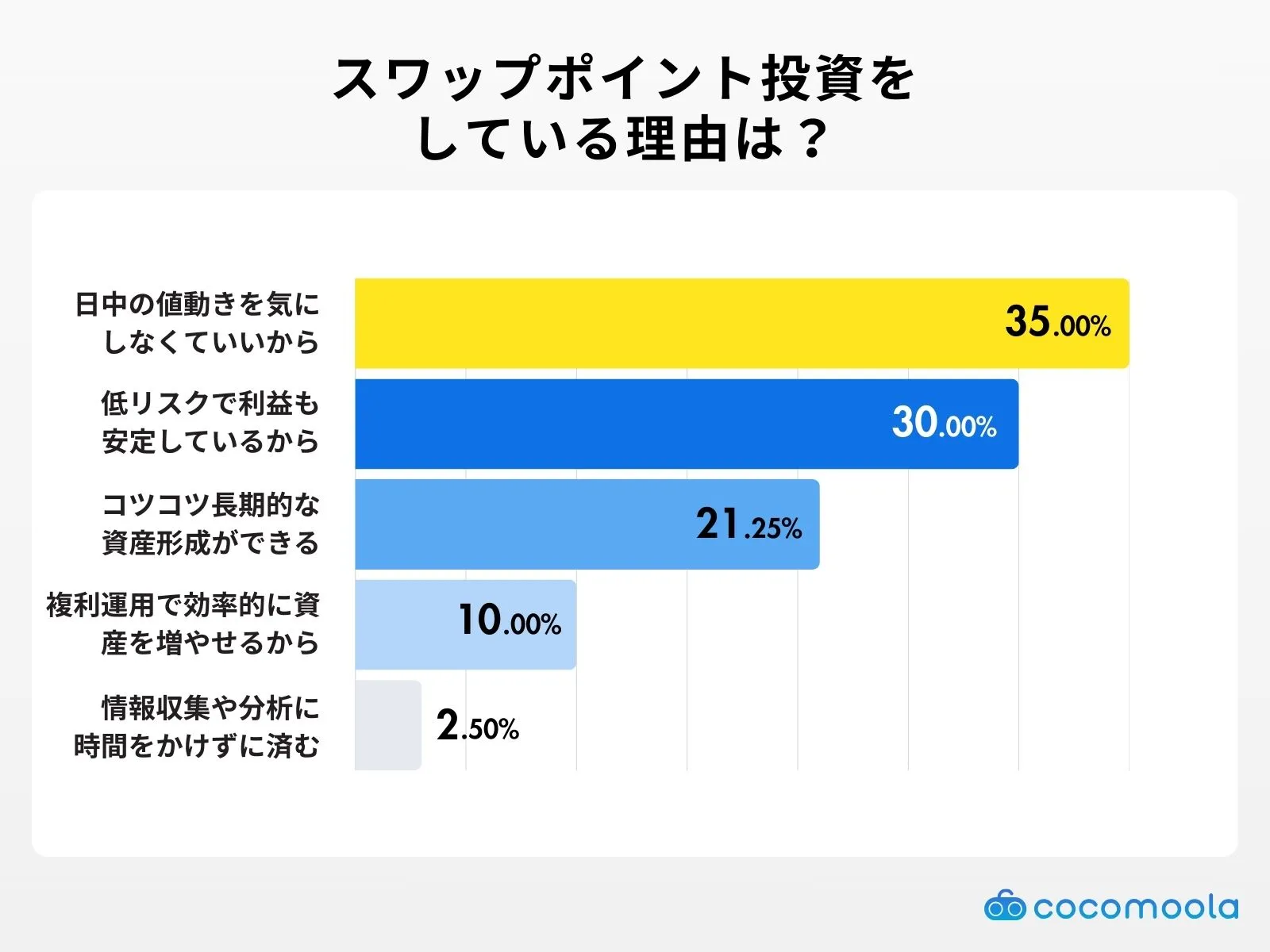 ココモーラでは、実際にスワップポイント投資を行っている人の損益状況や、魅力に感じているポイントを把握し、当サイトのコンテンツ制作に役立てる目的で、アンケート調査を実施しました。