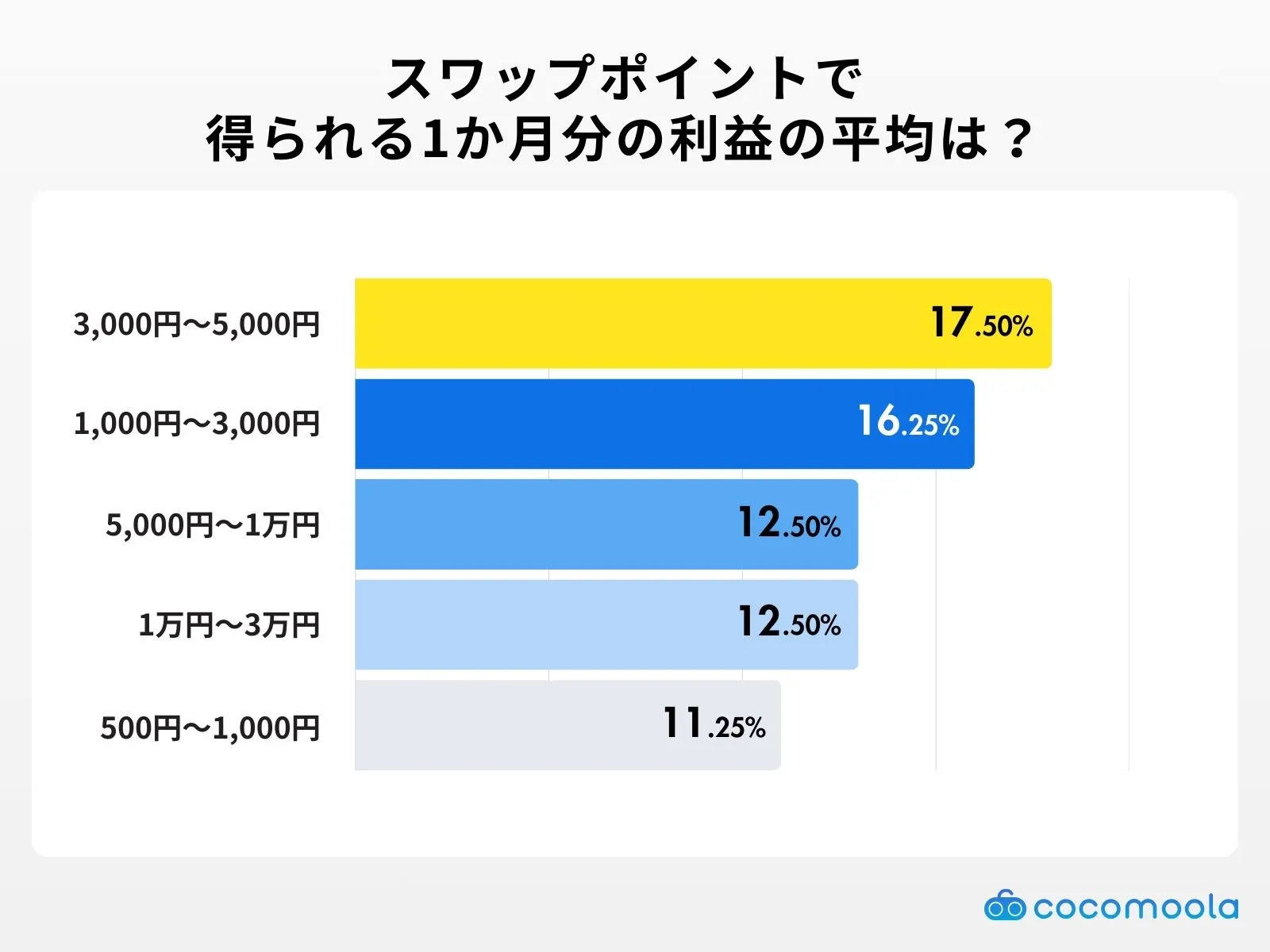 ココモーラが行ったスワップポイントに関するアンケート調査でも、スワップポイントによる1ヶ月の利益は、「3,000円〜5,000円未満」が17.50%で最多となっており、多くの人が数千円から数万円の範囲でコツコツと利益を積み上げていることがわかります。