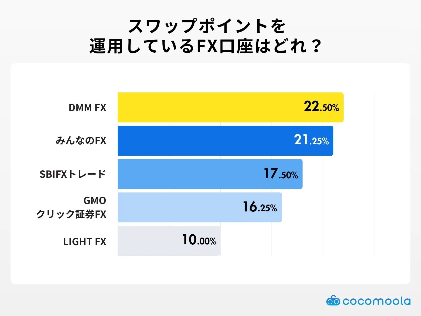 スワップポイントを運用しているFX口座のTOP3は、「DMM FX」(22.50%)、「みんなのFX」(21.25%)、「SBIFXトレード」(17.5%)でした。