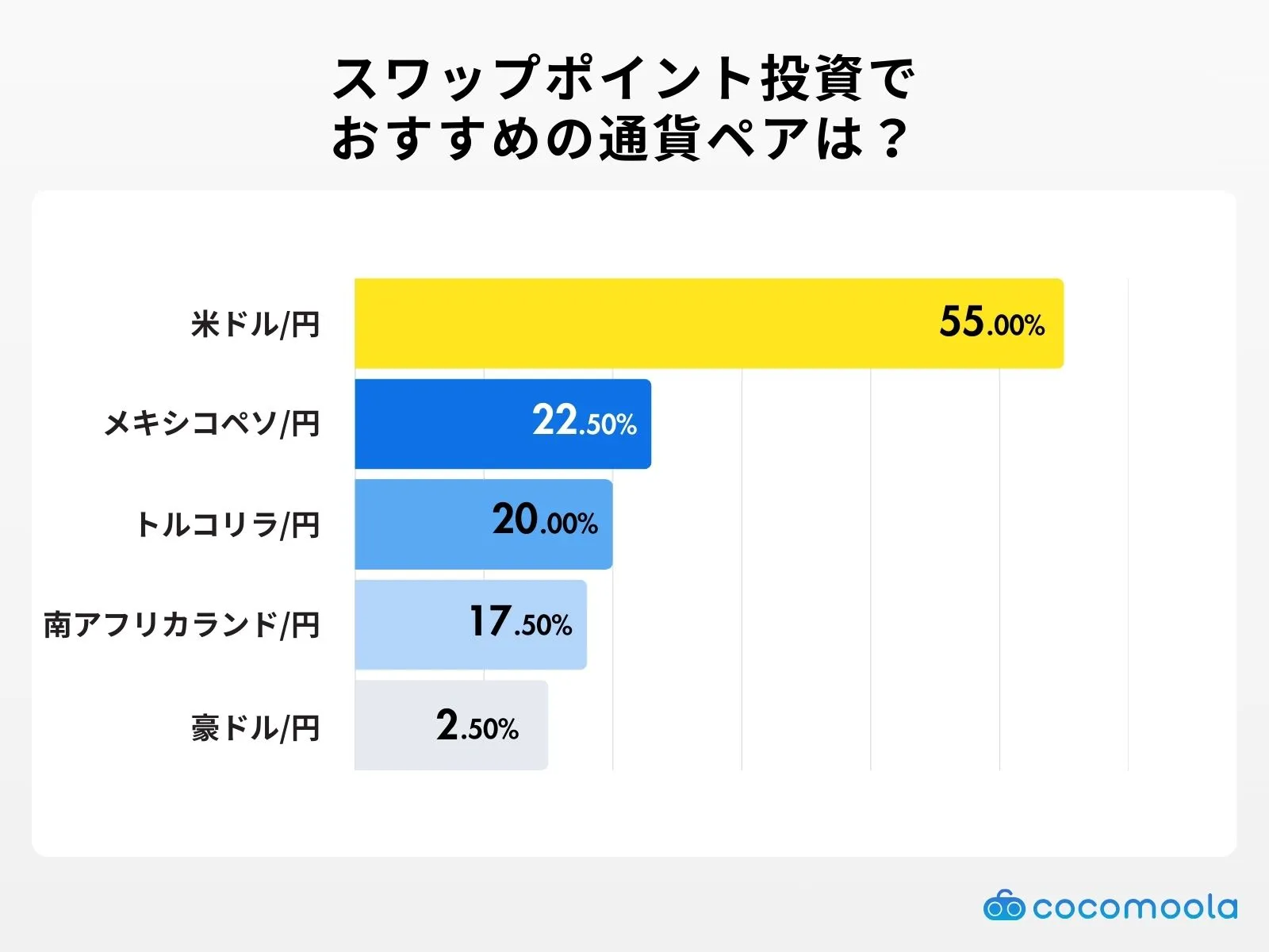 スワップポイント投資におすすめの通貨ペアとして、半数以上の人が「米ドル/円」(55%)を挙げました。また、「メキシコペソ/円」(22.50%)や「トルコリラ/円」(20%)といった、高金利通貨ペアも人気を集めています。