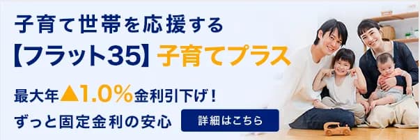フラット35 子育てプラス | 世帯属性(子どもの人数等)を評価 | 属性ポイントに応じて当初5年または10年の金利を引下げ(年0.25%〜1.0%※) | 若年夫婦世帯も対象。フラット35 Sと併用可能。 |