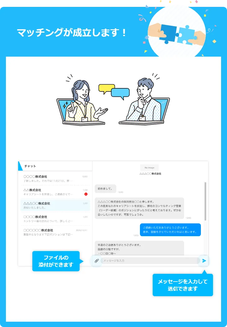 気になる企業に「いいね」を送ると、企業側も同様に「いいね」を返してくれた場合にマッチングが成立し、その後はチャット形式で直接コミュニケーションを取ることが可能です。