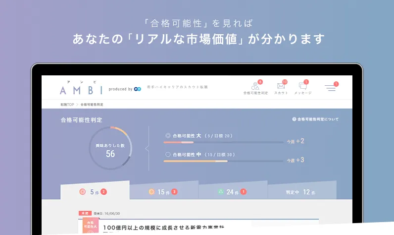 AMBIには、求人ごとに「合格可能性」を確認できる独自機能があり、応募前に選考通過の見込みを把握しやすい仕組みが整っています。