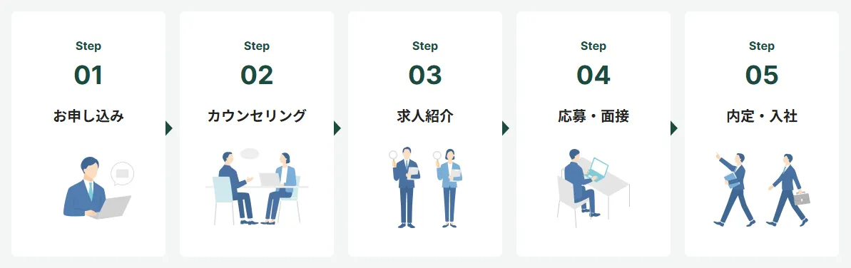その後、希望に合った求人紹介、応募書類作成・面接対策、選考サポートを受けながら転職活動を進めます。内定後は条件交渉や入社準備、入社後のフォローまで対応してもらえます。