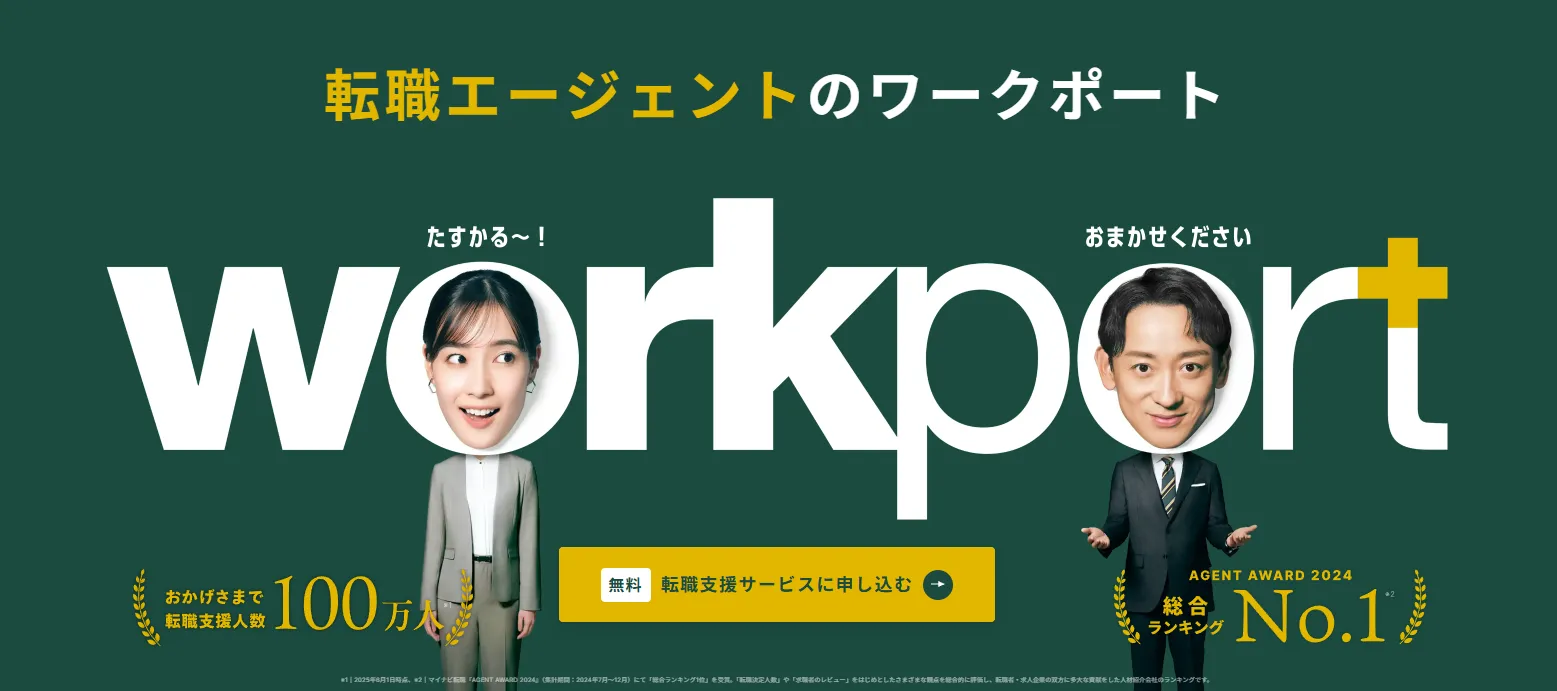 ワークポートは、完全無料で利用できる総合型の転職支援サービスです。専任の転職コンシェルジュが求職者一人ひとりに付き、キャリア相談から求人紹介、応募書類の添削、面接対策、条件交渉、入社後フォローまで一貫してサポートします。