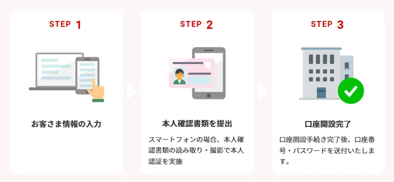 口座開設はオンラインで完結し、本人確認書類を提出すれば最短2営業日以内で取引を開始できます。スマホ・PCのどちらからでも操作可能で、初めての人でも比較的スムーズに手続きを進められるでしょう。